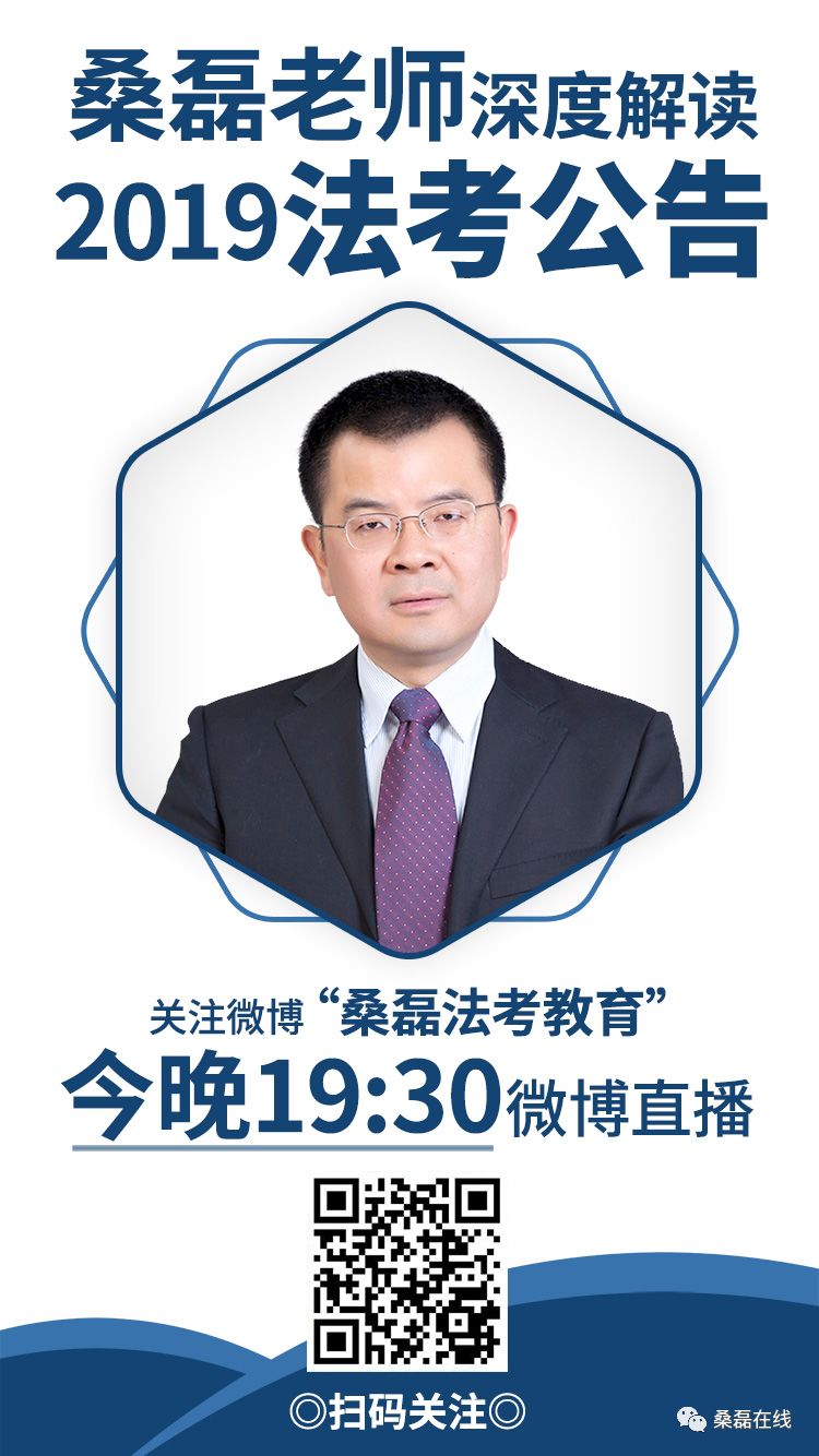 司法部近日发布2019年国家统一法律职业资格考试公告,客观题考试网上报名时间为6月5日至6月20日,考试时间为8月31日、9月1日两个批次,考生参加其中的一个批次考试;主观题考试网上报名确认时间为9月7日至11日,考试时间为10月13日。主观题实行机考模式,应试人员使用机考确有困难的,可申请使用纸笔考试方式。 桑磊老师将于今晚19:30在“桑磊法考教育”微博直播解读公告,敬请关注。